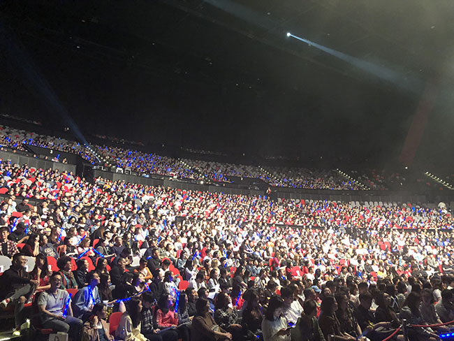 为了保证坐在后排及侧边的歌迷能清楚地看到台上演出的情景,此次主办方在设计上采用了常用且经典的造型——舞台中间设有一个